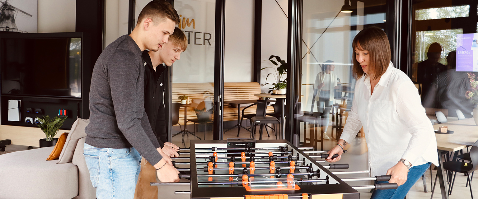 Unsere Azubis übernehmen früh Verantwortung und gestalten aktiv das Miteinander – sei es beim selbst organisierten „Azubiday“ oder dem regelmäßigen Monatslunch. So entstehen Gelegenheiten zum abteilungsübergreifenden Austausch und gemeinsamen Erlebnissen jenseits des Arbeitsalltags.